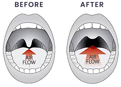 Sleep apnea is a more serious disorder in which breathing repeatedly stops and starts during sleep. It disrupts oxygen flow and puts strain on the heart, brain, and other organs. It could be as a result of airway collapse (obstructive sleep apnea=OSA) or a brain signal issue (central sleep apnea=CSA). CSA is not treated by the method described below, as it is a neurologically driven problem, not tissue obstruction.